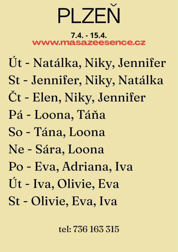 Vítám tě v salonu Masáže Esence, kde tě čeká dokonalá erotická masáž, při které zapomeneš na všechny starosti. Jsem smyslná dívka, která miluje doteky, ženskou energii a hru mezi něhou a vášní. Mým cílem je, abys odešel uvolněný, nabitý energií a s úsměvem, který ti zůstane ještě dlouho poté. Jedná se o erotickou masáž s ručním vyvrcholením – jemné, hravé a velmi intimní pohlazení, při kterém se tě dotýkám nejen rukama, ale také stehny, zadečkem i prsy. Každý dotek má svůj význam a každý pohyb probouzí tvoje smysly. Masíruji zcela nahá, aby bylo spojení ještě intenzivnější a přirozenější. Pro ty, kteří chtějí zažít něco speciálního, nabízím také extra masáže: Zpětná masáž tělem, pozice 69, footjob.